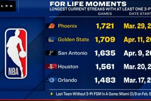 NBA球队上一次出现全场没进三分的情况还是在2016年2月6日(当地时间2月5日),该场比赛热火全队三分9中0。