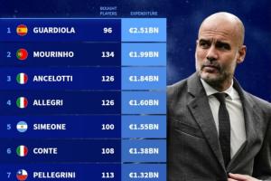 足坛历史主帅引援花费排行:瓜帅25.1亿欧领跑,穆帅19.9亿欧第二