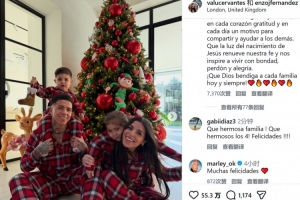 体育资讯12月26日讯 切尔西中场恩佐更新社媒,晒出圣诞节合照,并写下圣诞节祝福。