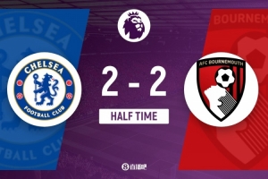半场-切尔西暂2-2伯恩茅斯 埃斯特旺造点帕尔默点射恩佐破门