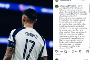 罗梅罗写道:“向所有追随我们的球迷致歉,你们一直都在,也会继续支持我们。我们对失利负有责任,这一点毫无疑问,我首先要承担责任。但我们会继续直面问题,努力扭转局面,为了我们自己,也为了俱乐部。