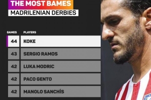 科克超越拉莫斯成为马德里德比出场最多球员,位居两人身后的是莫德里奇、亨托以及桑奇斯的42场。