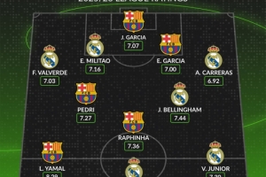 体育资讯1月11日讯 皇马和巴萨将在本轮西超杯狭路相逢,whoscored也统计了两队本赛季西甲评分合体最佳阵,亚马尔、姆巴佩领衔。