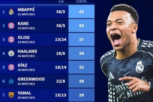 本赛季参与进球榜:姆巴佩、凯恩43球,哈兰德、青木、亚马尔在列